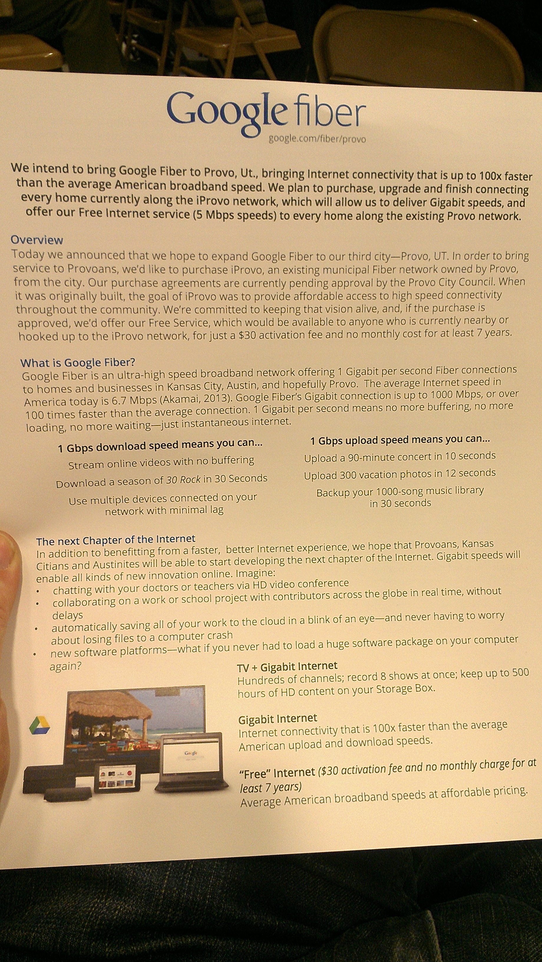 And so, after roughly a year of discussion, we have their formal offer to connect Provo to Google Fiber. A key component of this offer involves providing a minimum 7 years free 5 megabit-per-second internet access to every resident.